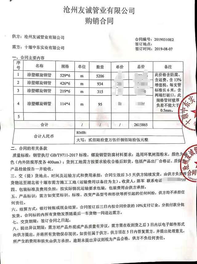 湖北十堰中东实业有限公司与我公司签订的管廊工程用内外涂塑复合钢管合同,我公司确保质量为原则,保障工期为根本,赢得了客户的好评,通过我们不断的努力十堰管廊工程我们又合作的另外两个标段